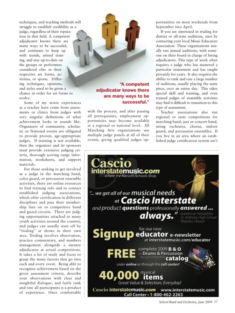 Closing paragraph: Few consider judging a glamorous life. Millions of people still remember when the French judge was accused of tainting the Olympics in the figure skating competition. Certainly this person was qualified to represent her country at the Olympic finals, but clearly her ability to remain objective and focus on the actual performance were compromised. People will remember when judges make mistakes, but if all goes well and no one is surprised when the scores are announced, the judges simply go on their way. There is not a lot of glory in this activity, but it certainly can be rewarding. To have a teacher or performer thank you for your help and insight is special. However, reputations are on the line every time someone chooses to judge and rate performances of an artistic or athletic nature. It is a big responsibility and still challenges my knowledge and experience every time I grab a clipboard and sign my name as the judge for today’s competition.