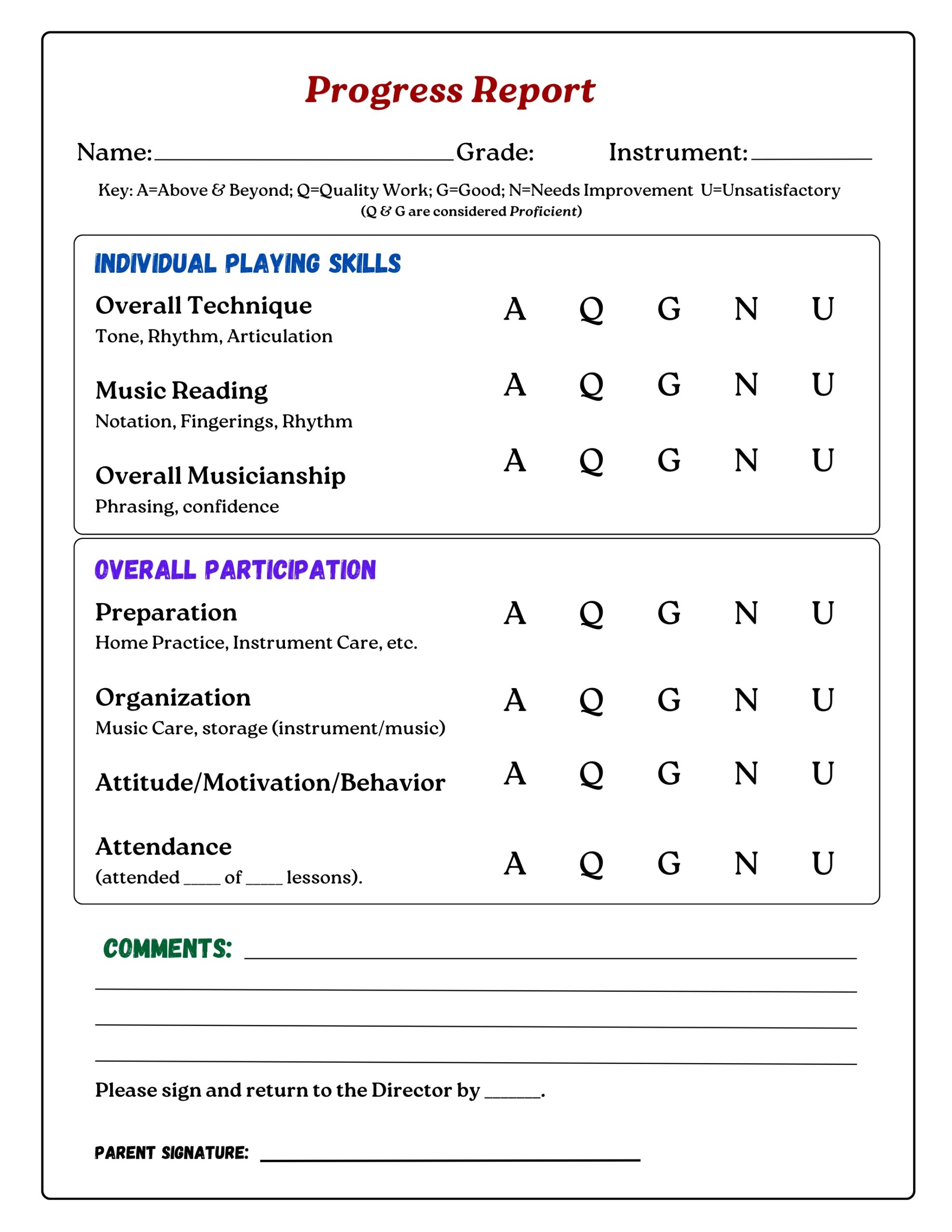 This was developed for a middle school band program that was NOT graded. This was our mid-year parent check in form to communicate student progress. You could swap out the A=Above & Beyond; Q=Quality Work; G=Good; N=Needs Improvement U=Unsatisfactory letters for whatever terms you may use at your school. We avoided ‘Excellent’, and made sure that the top 3 ratings were considered degrees of proficient. This had no bearing on students academic record, just an internal document to offer feedback to students and parents.