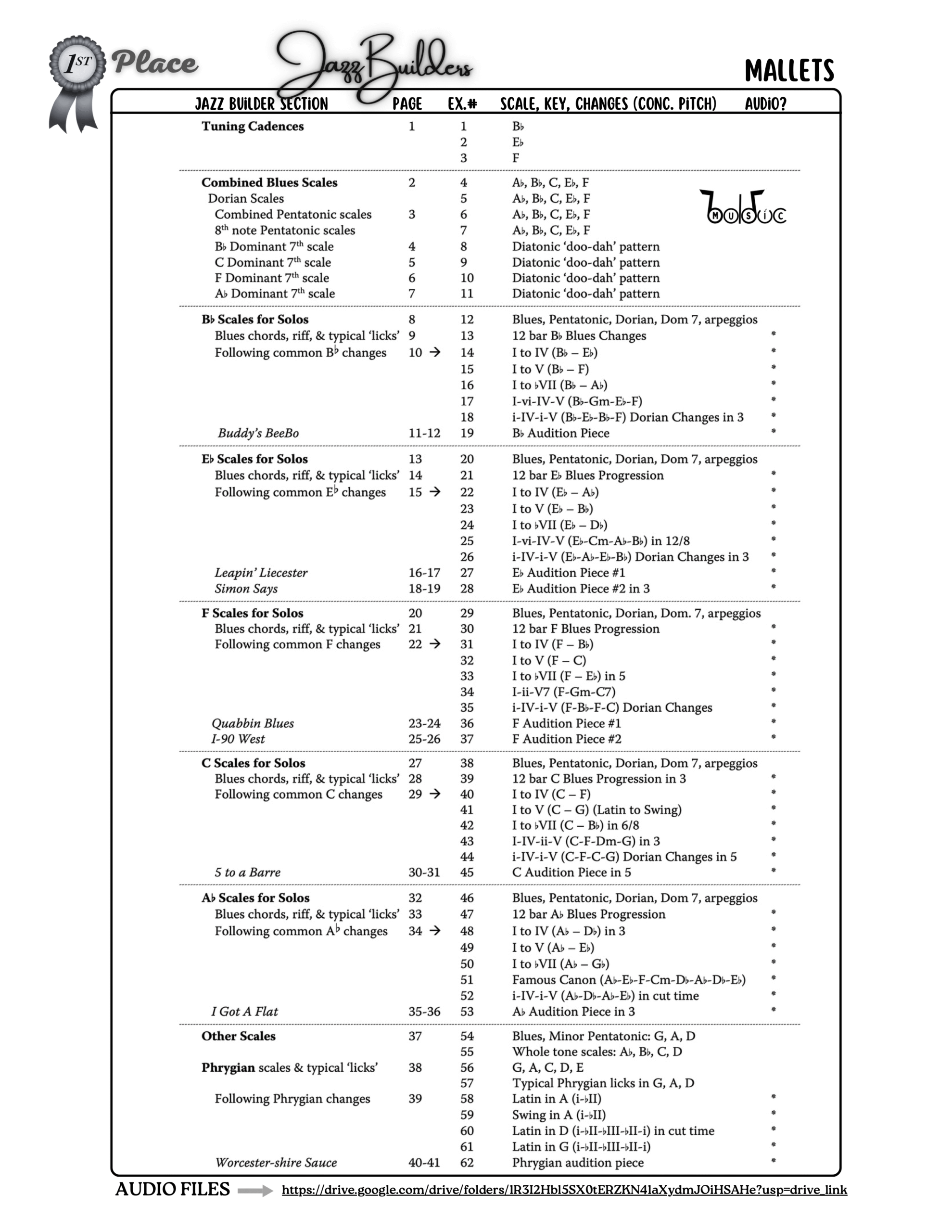 The Jazz Builders Mallets Book is an ideal curriculum for jazz and rock band programs. Featuring fully written rhythm section parts, including guitar and bass lines with TAB and chord blocks, this book ensures that all players—whether in a group or solo—can fully participate.